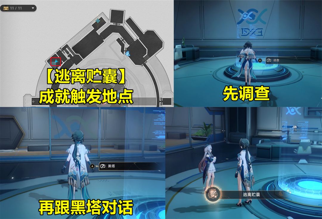 【逃离贮嚢】:来到地图左上方的小房间里,进门就能看到房间中央有一个透明的贮物罐。靠近点击调查后再选择“伸手触碰它”,然后会触发一段对话,并且黑塔出现救了我们。然后记得跟黑塔对话,选项不重要,对话过后就能获得成就。