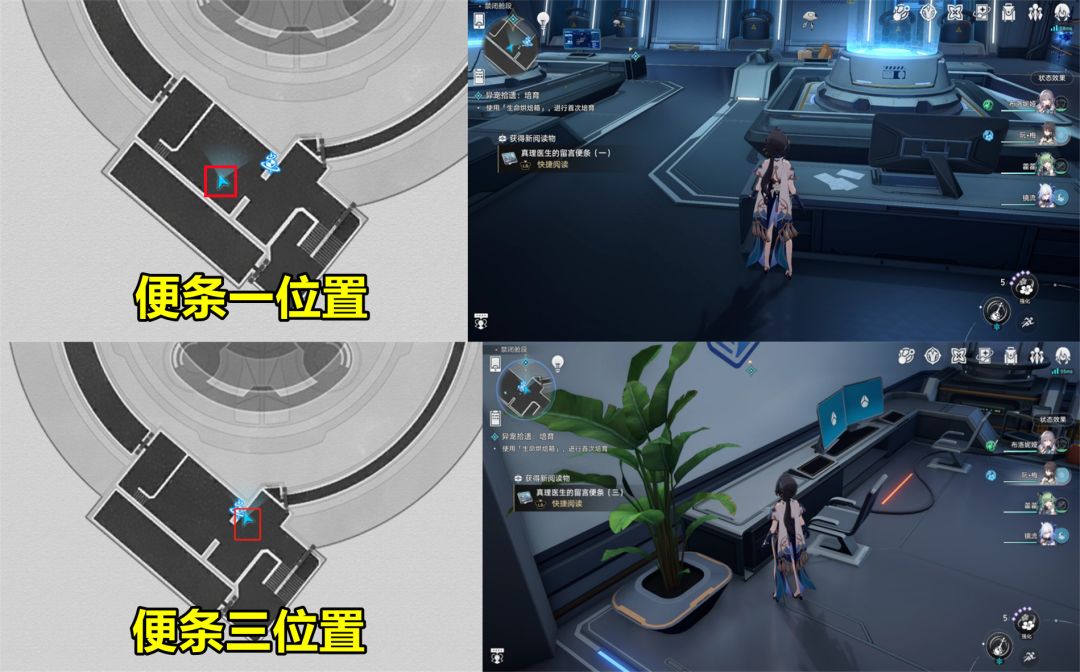 接着来到虫皇boss所在平台的传送点,往西北侧稍微走一段路就能看到一张(便条二)。最后一张在上方传送点,往西侧的一处小通道里,两个机器人和几个阮梅造物聚集的地方,靠近会出现拾取选项,这就是第四张便条。全部收集完,自动触发成就。