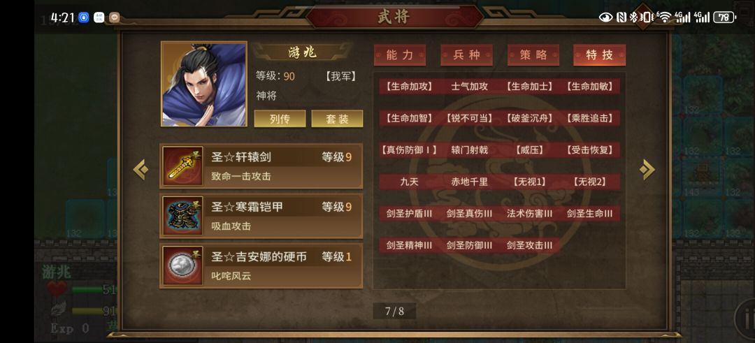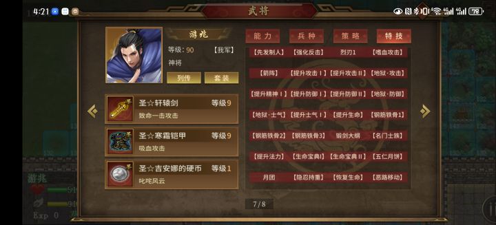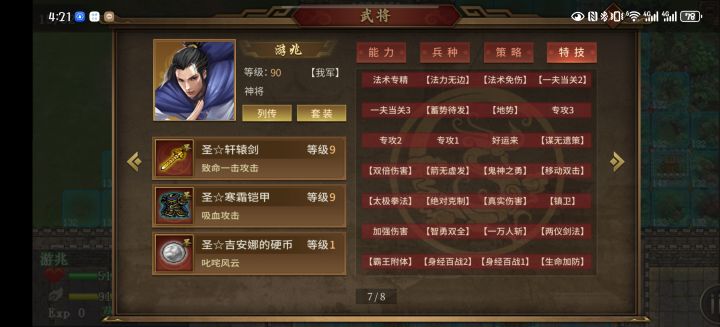 8个出场的剩下5个里我放了神刘备配桃园结义回血;神浮生带刑天斧,降敌全能10%+降敌士气15%;神姜维带指环负责保命+加全能10%;最后两个酱油,一人带混铁棍一人带金箍棒,给敌人降攻降防10%。基本就能顺利过关了。