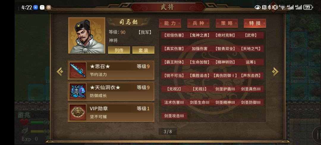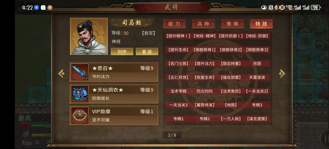 这关地狱难度还是挺恶心的,不氪金应该过不了,反正我是氪的。进攻主要靠自定义,神皮+圣套,技能能加全加满。果子只要吃3500武力和2000防御基本就够了,仗着蓄势待发到后边肯定能干掉阴八卦。剩下的阳八卦只能靠神司马了,神皮即可无须圣套,带着徽章二动,先混乱,然后施法。加上酱油上去瞎砍砍触发雷追,一个回合能搞定。
