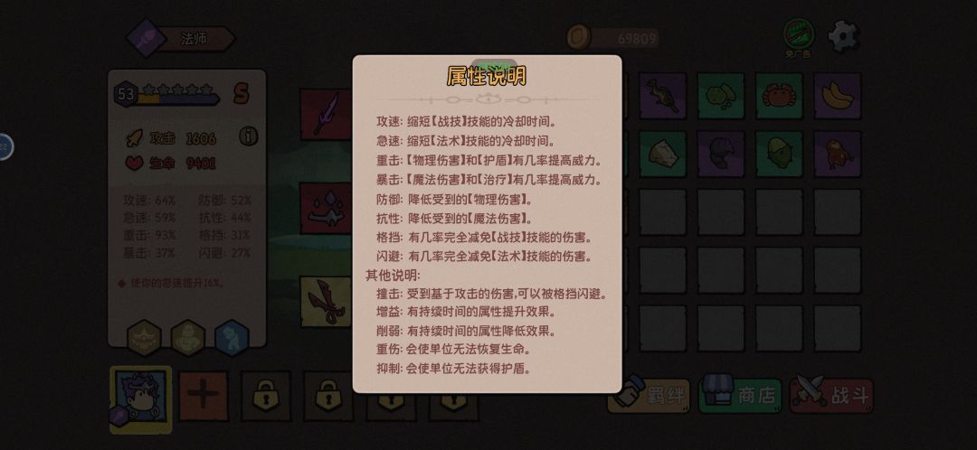 前期尽量升级商店,随便选装备过度就可以40关前拿到护盾珠提高容错,重点避开抑制斧头(图八)的怪物不让回盾。