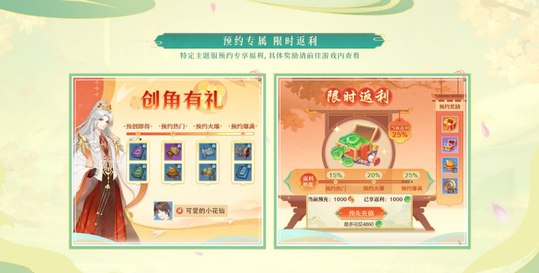 提前预约【青丘出世】主题服预先创角可获小金丹、人物经验书等创角礼包!预充值更有限时返利!最高可返4860灵玉。