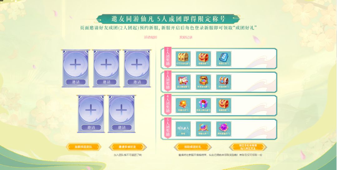 邀请好友成团(至少2人团)预约新服,绑定成团后,每一位在团成员都需在新服有登录行为,即可领取对应档位的成团好礼,每个账号仅有1次领取奖励机会。
