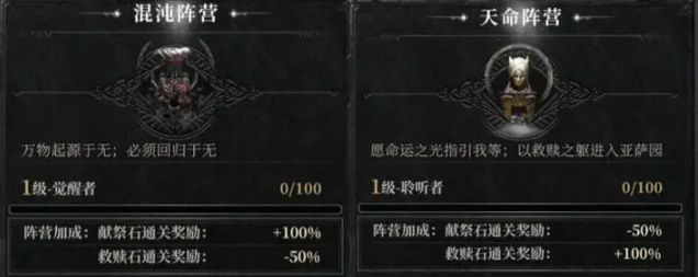 主线打完boss后会选择献祭还是救赎ta,选献祭的时候会得到献祭石,选救赎的时候会得到救赎石,如果你是混沌阵营,那你选献祭的时候献祭石通关奖励+100%,但选救赎奖励就会-50%,对应的如果你是天命阵营,那选救赎能+100%,选献祭会-50%
