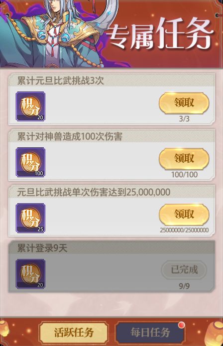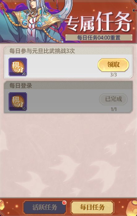 专属任务说明:每日任务将在每天4:00重置,完成即可少量多次领取积分;活跃任务活动期间内有效,完成条件更高单获取积分也更多