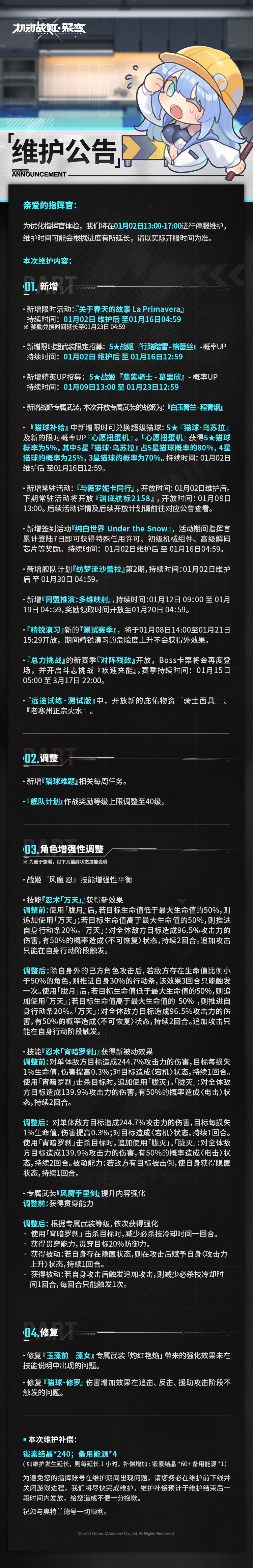 整修完成后我们会为您提供相应补偿物资【锻素结晶*240+备用能源*4】