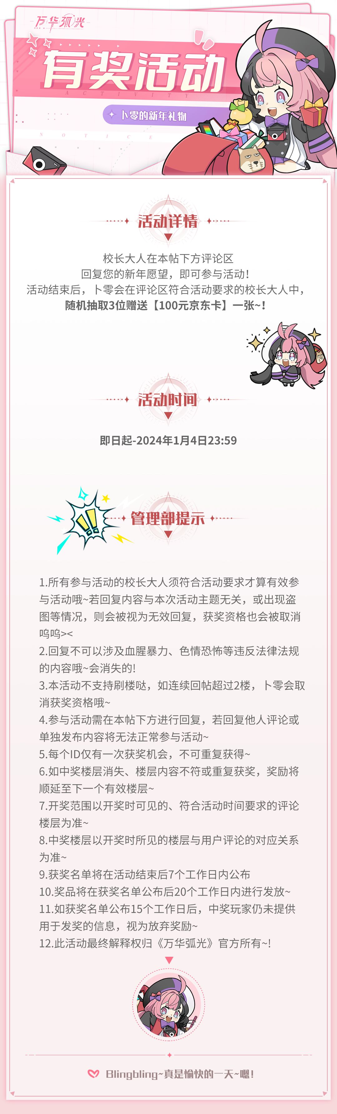 校长大人快来本帖评论区留下您的新年愿望~卜零会从评论区符合回复话题的校长大人中随机抽选3人掉落【100元京东卡】一张(●'◡'●)!