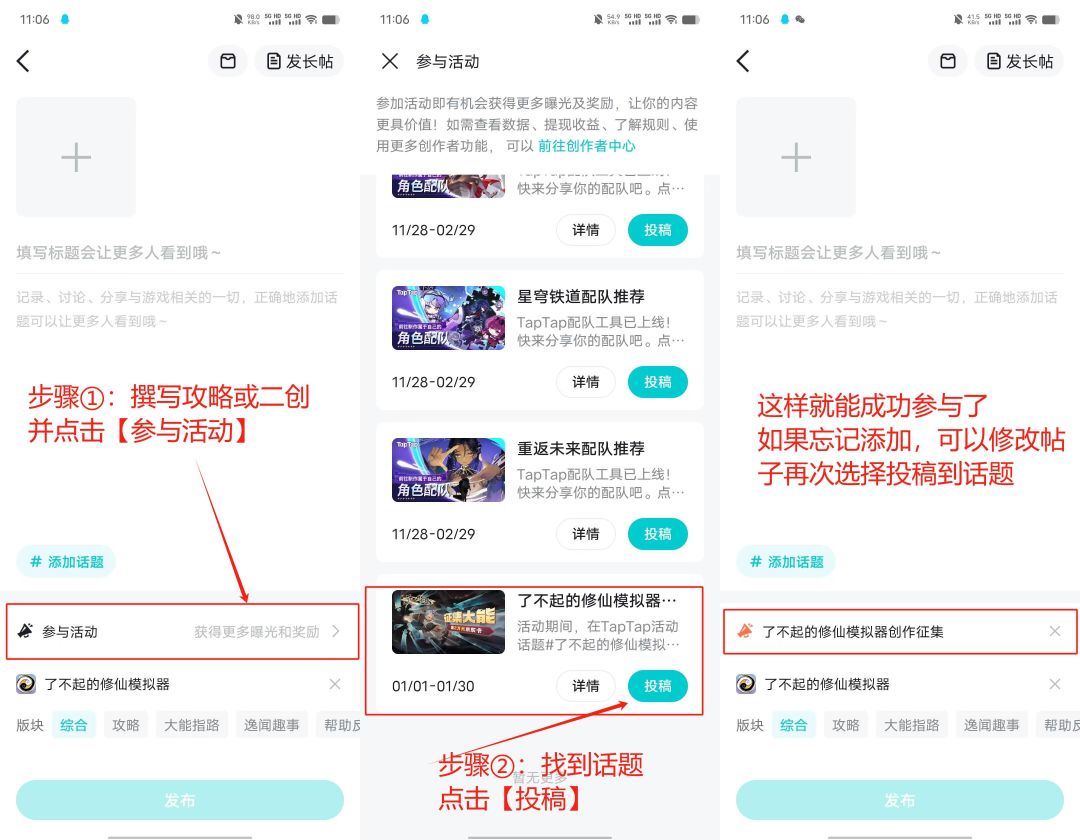 活动期间,在TapTap活动话题#了不起的修仙模拟器创作征集#发布相关攻略或二创作品,即可成功参与活动。