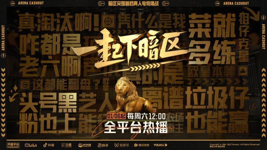 暗区突围首档真人电竞挑战1月6日中午12点强势开播,先锋们可前往各大平台暗区突围官方直播间观看!网聚线上线下暗区顶流,真人出镜在线受苦受难,尽在「一起下暗区」!