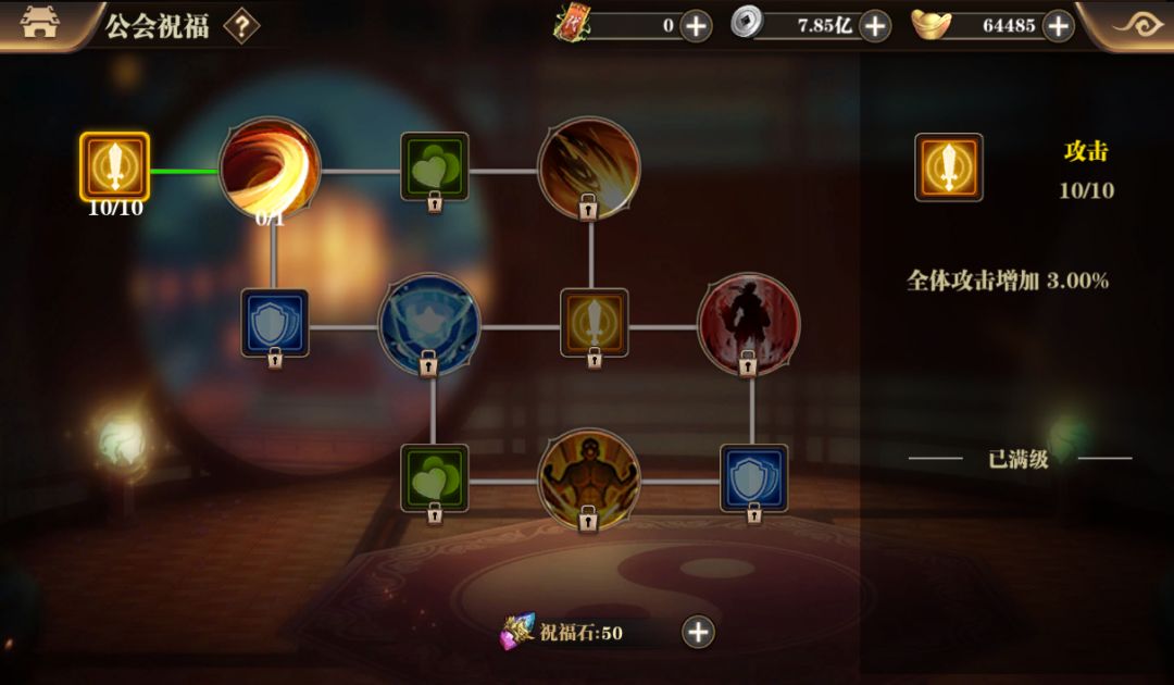 公会祝福:消耗祝福石,可选择升级需要的技能。