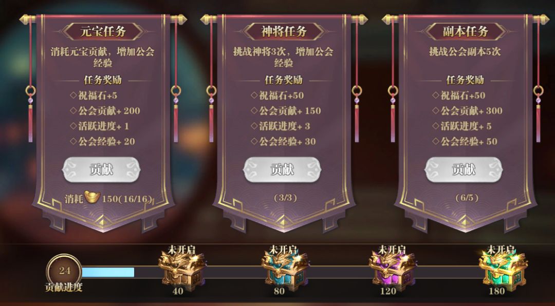 公会建设:公会捐献有3种方式,每天可选择一种方式进行捐献。捐献进度达到对应要求后,公会全体成员均可领取进度奖励。公会等级越高,捐献进度奖励越丰厚。每日24:00,系统会自动清空当天捐献进度。每日捐献次数不能超过公会成员上限。