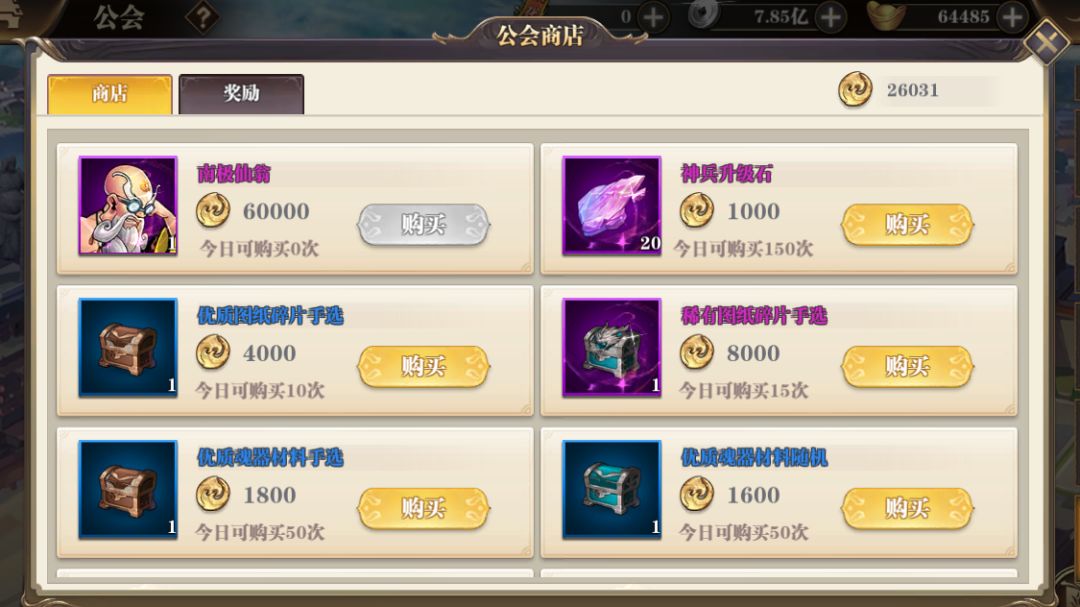 公会商店:消耗公会贡献,可购买所需要的材料,公会等级越高,商店也会开放更多的道具奖励。