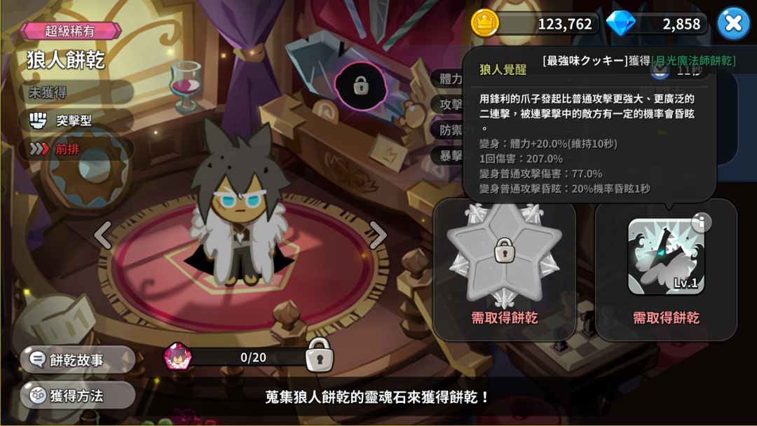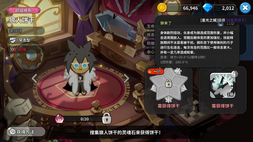作为前排突击型的狼人饼干,拥有范围攻击技能,变为狼人的时候不仅攻击范围变大,体力加了20%,还可以对敌方造成晕眩,关键时候晕眩能带领队友翻盘。