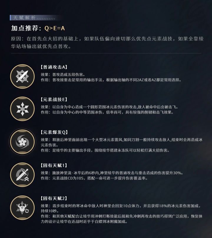 由于寒冰命中敌人会带来增伤效果,此天赋推荐大家绫华在贴近敌人的位置上作战,寒冰命中敌人回复的体力与启动霰步消耗的体力相同。