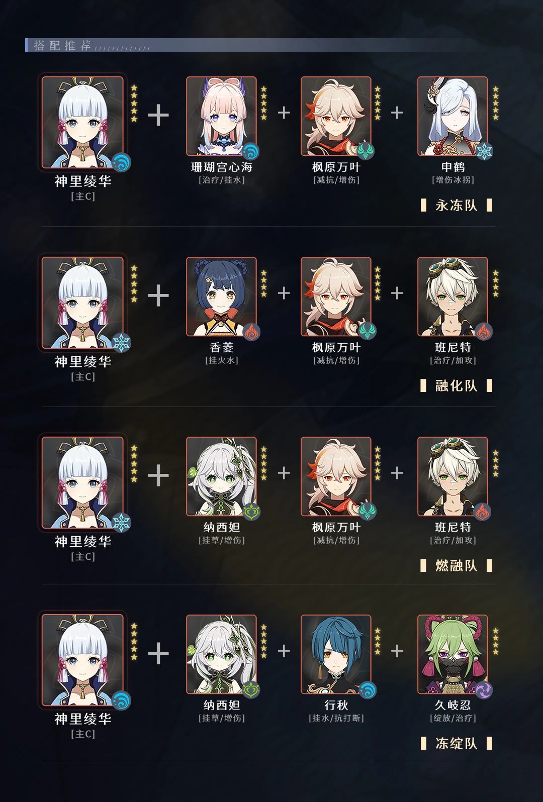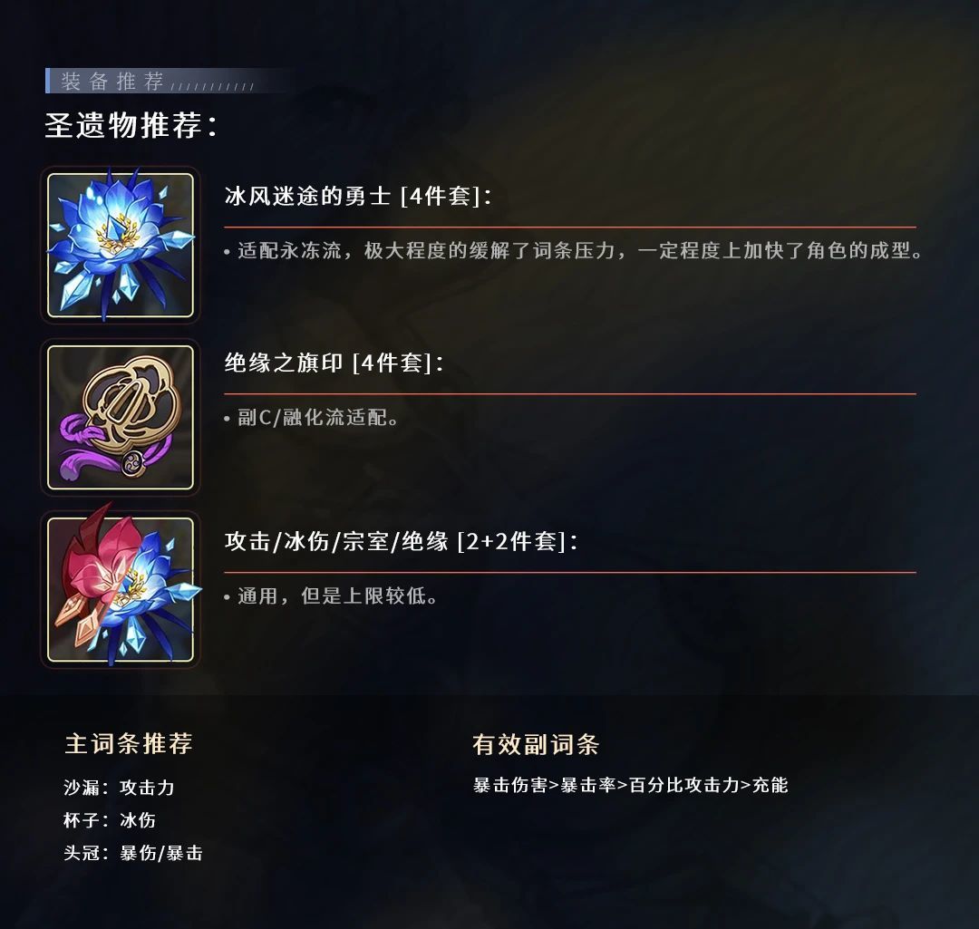 虽然现在深渊大部分怪物已经冻不住了 但是目前神里绫华主流仍然是永冻,四冰套降低很多养成成本 故仍然作为最优先的推荐。