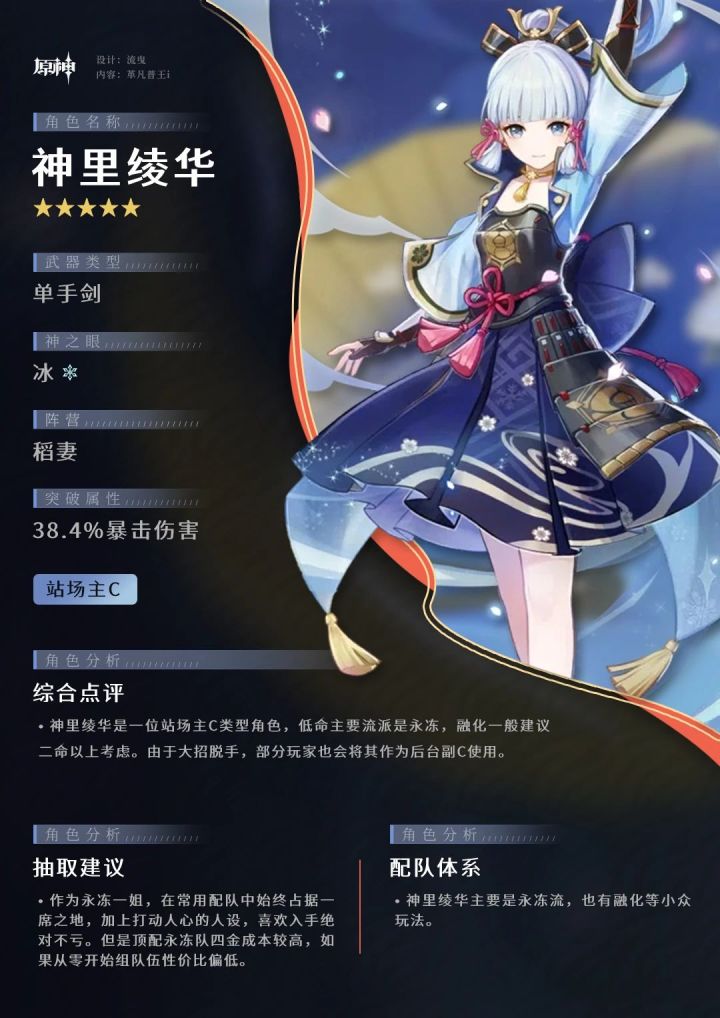 神里绫华主流思路仍然是永冻,该体系对环境适应性较差,但是一旦有适合发挥的环境,永冻流则会有十分亮眼的表现。对于神里绫华本身来说,她是一名合格的主C,缺乏主C的玩家可以考虑抽取。但是,神里绫华想要在如今环境中取得优势,往往需要更高的成本造价,所以如果完全从零开始,不太建议抽取神里绫华。