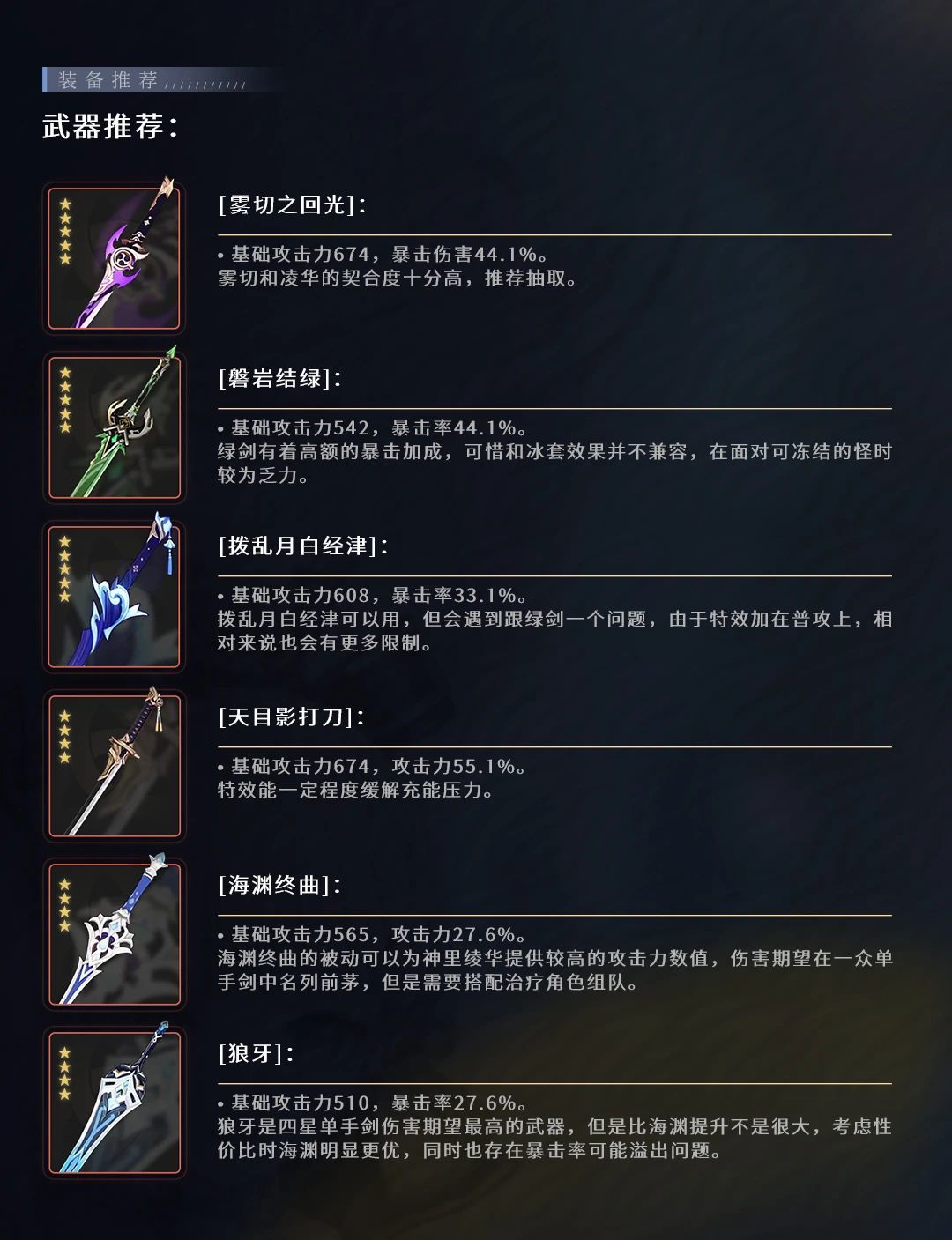 神里绫华的武器选择相当灵活,一般遵循双爆/攻击力优先的原则,可以缓解充能压力的武器也有所加分。基本上以雾切作为最优,其他输出武器可用的