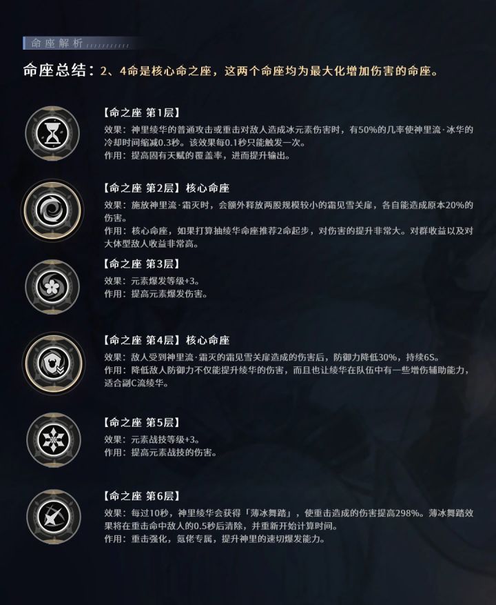六命:秒天秒地秒空气,但是只能10s触发一次,是氪佬的快乐命座。一般玩家不建议考虑该命座 性价比很低。但是如果是神里绫华单推人,该命座也是有一定收益的,可以入手。