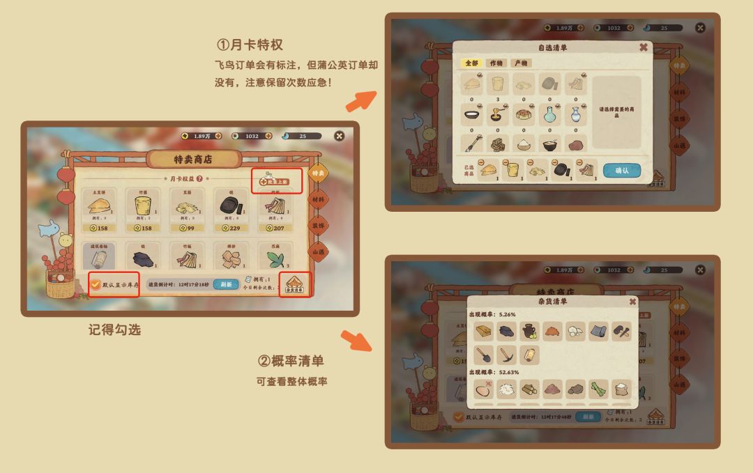(1)商品,分为作物、产物、道具、材料,出现的种类取决于我们的等级(解锁作物)不同商品概率不同,可查看右下角『杂货清单』