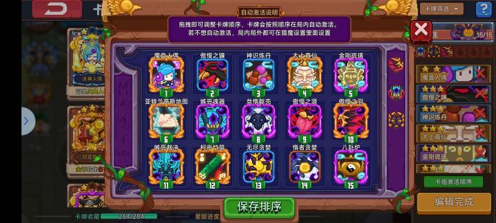 卡组关键卡也就前面10张,卡牌激活顺序不一定,看环境。建议要么先叠原罪层数吃宝物加血量(注意不要吃变身道具)。要么先炼丹渡劫,不过要先激活金刚,不然丹够了,劫渡不过,(如果金刚高星,建议先激活,谁能拒绝好几秒的无敌时间呢)。最关键的来了,太乙需一星(主要炼丹,境界需金丹)。带神识炼丹主要是为了加速自己快速成为金丹境界。注意神识炼丹产的丹不够自己到金丹,或者期间化功的,然后队伍小伙伴不能生产丹,就先激活八卦炉,已保证自己到金丹境界。然后嫉恶魂器星越高越好,这个和后面伤害、体积能变多大挂钩。那问题来了,太乙和嫉恶魂器分别是丹修和原罪的核心卡,如果这两个高星,基本丹修和原罪其他卡牌不差,都随便打,一个辅助顶流,一个版本之子,当你丹修和原罪玩的差不多了这个玩法也就差不多会了。
