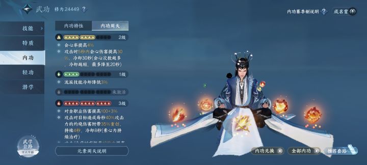 三火内功推荐:必带日月+崔峰 可选有众妙(点名炉次选过渡) 破重云(可用冲虚代替) 绝电飞光(鸣干戈 破釜可替换)