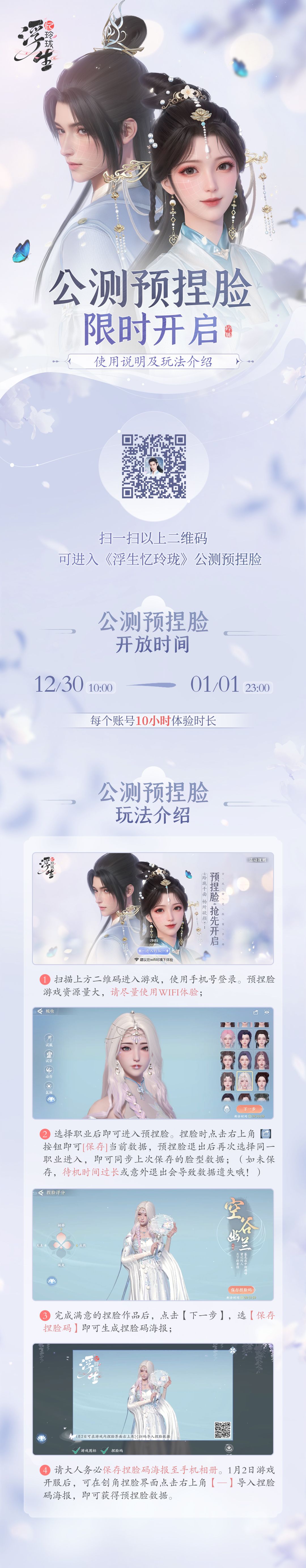 12月30日10:00~1月1日23:00期间,「浮生忆玲珑」公测“预捏脸”系统限时开启!