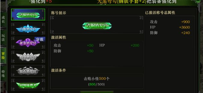 青铜治安官,击败小怪500个,攻击+50,HP+200,防御+50