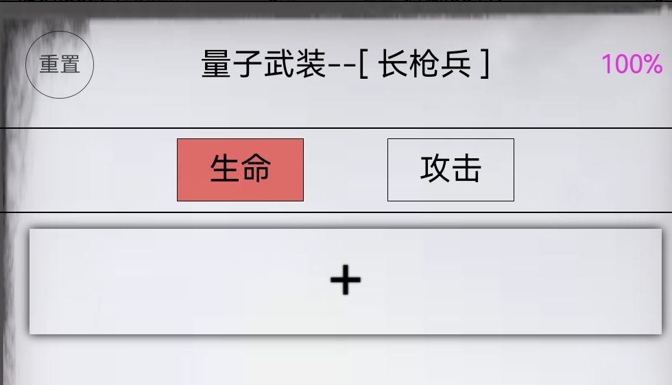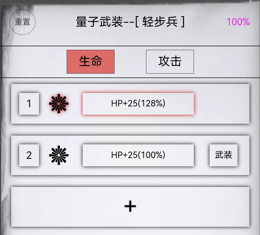 下方:开阵,量子武装每开一栏属性被称为一阵,生命和攻击各16阵,生命使用各种“花”升级,而攻击使用各种“果”升级,点“+”之后如图所示: