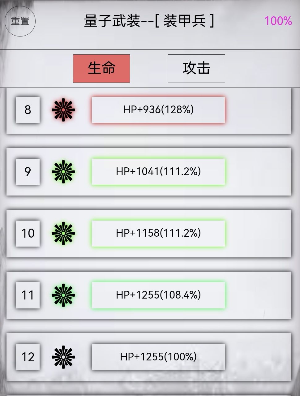 比如你现在的装甲生命8红属性是16000,8红9白的属性就是16000+936=16936【加多少属性看自己8阵红的属性是多少或者最下方蓝底图】
