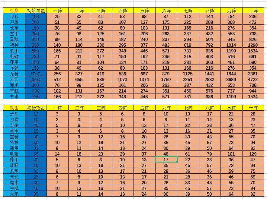 爆阵的具体数量需要结合实际情况,比如你电磁只打算练到64e,128e改用未来,那么电磁就可以提前爆阵了,血7红11/12白,攻6红10/11白,参考梦里64e电磁属性9900-1300,具体阵数根据后面详表自行计算调整。