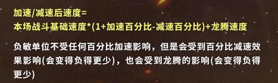 关于负敏单位的举例:男鬼玩家法斗进入战斗后基础速度为-400,被我方男魔枸杞施加了加速法术(加速百分比为39%),又被敌方精卫施加了泥足巨人(减速25%),本回合初男鬼法斗的孩子又触发了龙腾,效果为加速100点。则此时男鬼法斗速度=-400*(1-25%)+100=-200