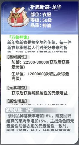 目前第一件衣服带战利品掉落几率的装备。生存能力够的前提下,装备配合七彩的话会让掉落物最大化,即使开宝箱会翻倍,这个效果真的是非常夸张。如果这件装备是草属性啊,配合艾米自身的魔瞳效果的话,我去月神副本开宝箱那就非常非常爽。