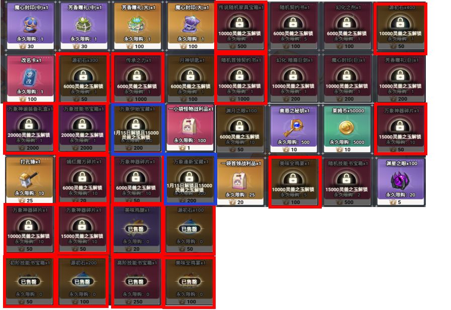 因为我们目标是要搬空商店,但是这样的代价可能对大家来说体力可能不够刷。我把个人认为必须要去搬的对象和大家一起共享一下。这个前提是实力的提升,所以针对于某一些道具,我会进行一些放弃。么这个是个人喜好,大家也可以自行选择。毕竟要刷这么多,除非你体力很够的前提下。可能无法达到所有的道具半空。有两个宝藏各300个新的装备和新的书籍。这个是我们最终的目标。有一些性价比比较高的道具,我也会作为对象。