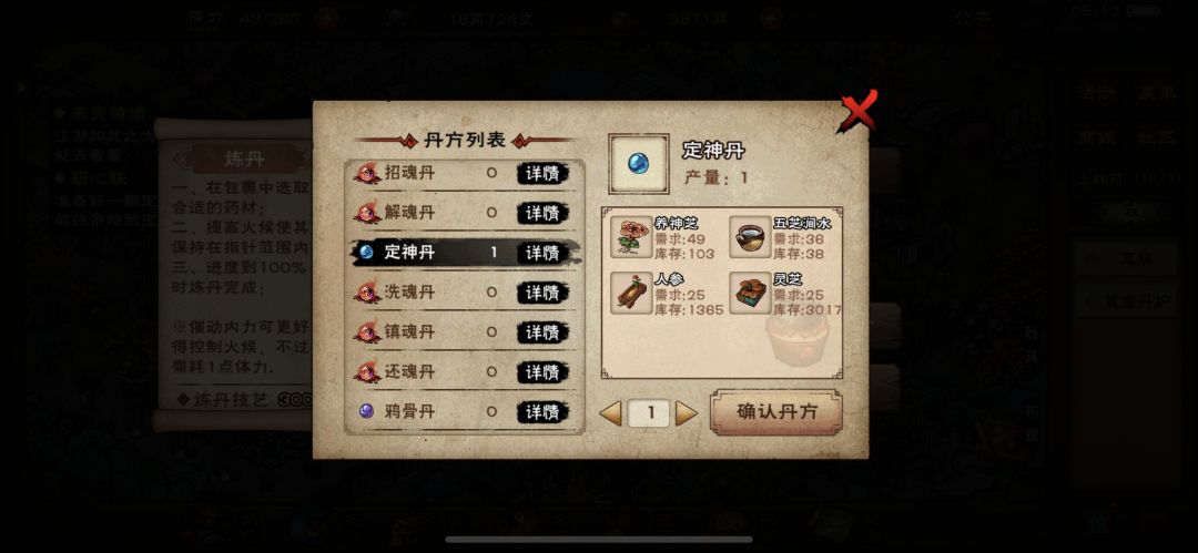 剧情后得知需要准备一颗定神丹(养神芝*49,五芝涧水*36,灵芝*25,人参*25)