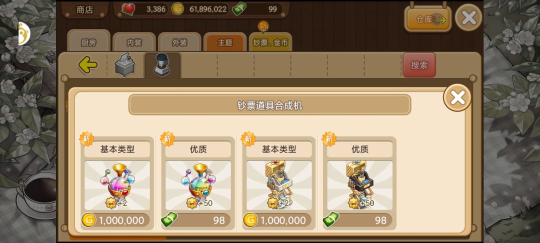 上面是金币买的,下面是钞票买的,这样一对比,其实也没有多大区别。两种钞票道具合成机的稀有概率上限都是10%,用钞票买的需要的时间少一些。另外,合出来的道具都是一样的。