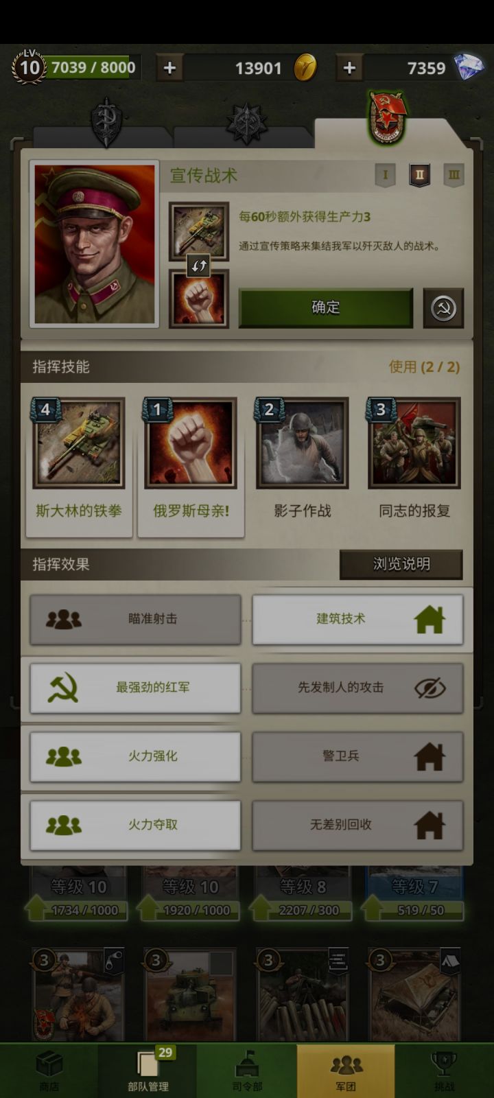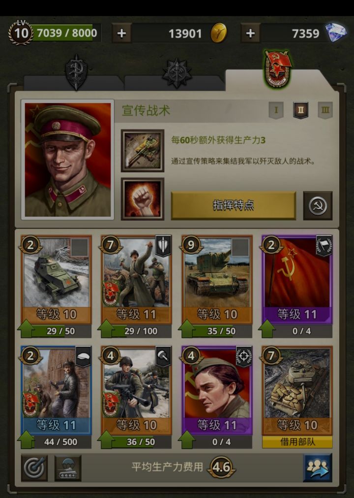 核心卡租借美国酱爆(抗伤害),旗手(减伤),后边近卫军输出,游击队带铁拳攻击防守都好用,狙击手清步兵,2费装甲车踩地雷用,KV2一直是个强度很高的卡,特别是有酱爆抗伤害,步兵掩护的情况下,其他单位推进到对方基地前会被源源不断的增兵吸引火力,而KV2范围伤害表示我全要。技能IS2配俄罗斯母亲,如果第一波酱爆步兵没赢的话,第二波的酱爆就要搭配IS2一起冲,第三波就要和IS2+KV2一起冲,碰到大和炮之类的高爆发攻击可以采用拉长战线,分两路,旗手减伤硬抗三种方法。