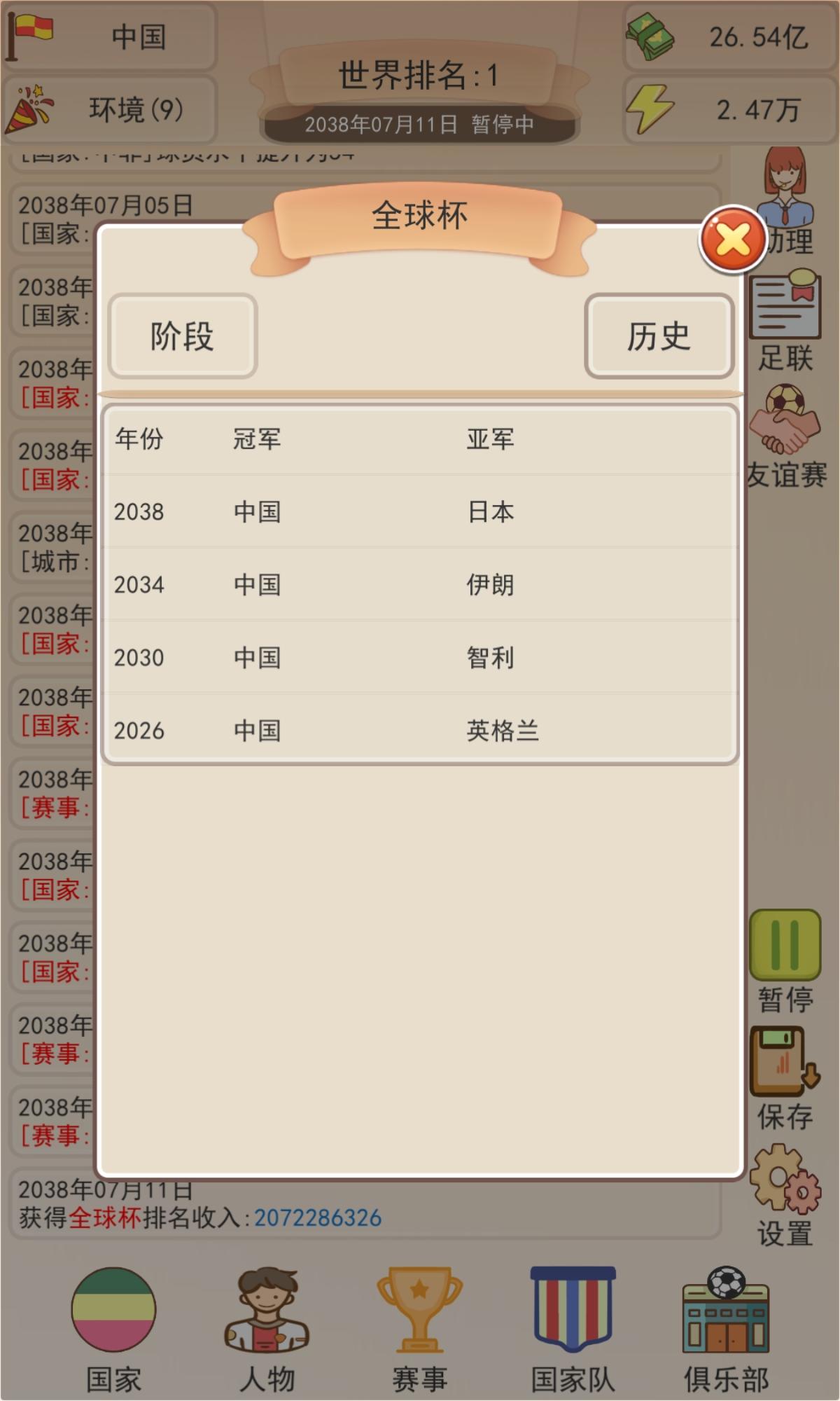 如图,开裆得看广告,第一次世界杯比较难,可以刷开局,找个教练和规划一个好前锋啥的