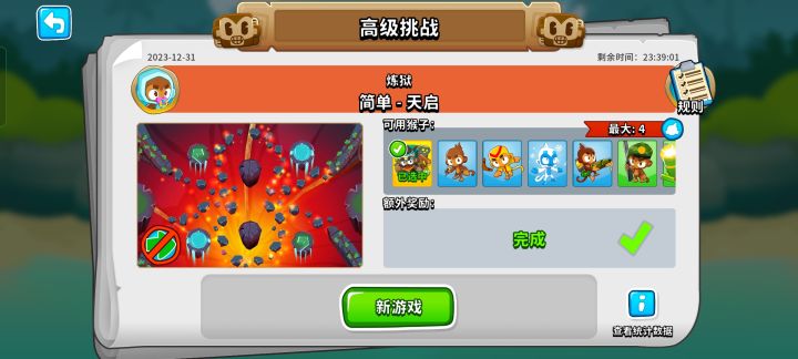 打完忘截图了,我是用两只4-0-2回旋镖猴和两只2-0-4飞镖猴通关的,回旋镖猴位置入上图,飞镖猴位置在它上下方挨着,前期先放一个0-0-2回旋镖猴,然后升2-0-2回旋镖猴就放第二只回旋镖猴,等看到第一个迷彩气球就放飞镖猴升0-0-3,后面慢慢升就可以了,前期可能会丢血,39波或40波(忘了)会漏掉部分迷彩气球,但问题不大,只是不能满血通关而已。