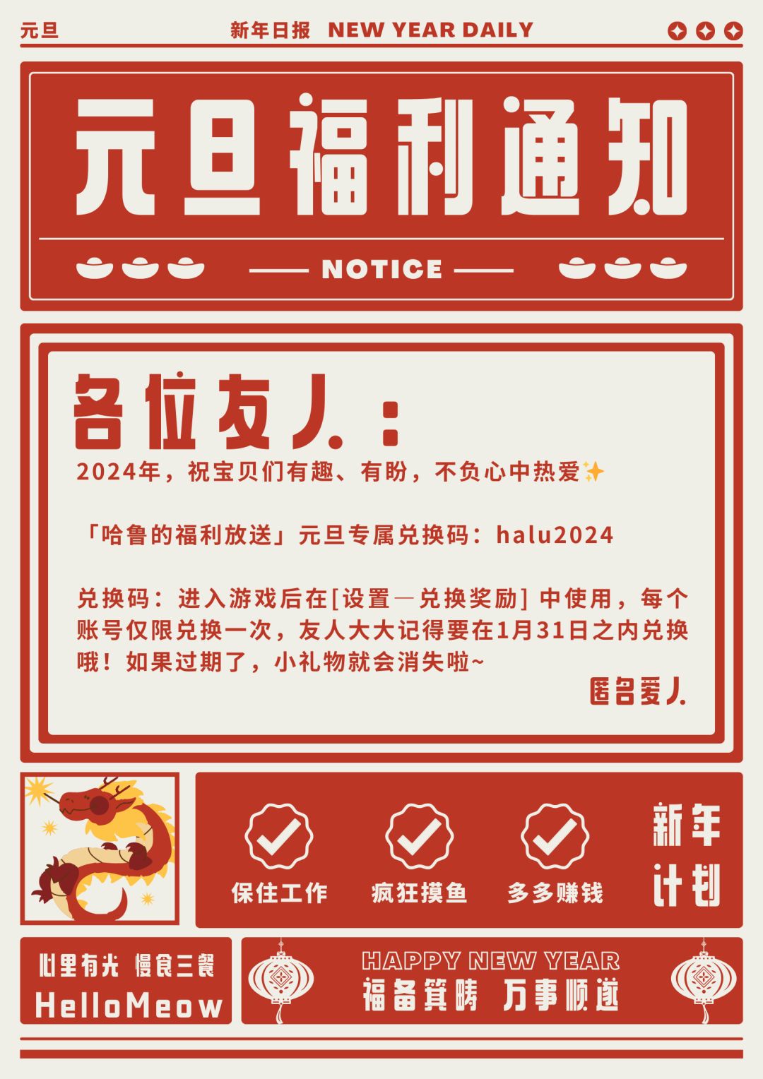 「哈鲁的福利放送」元旦专属兑换码:halu2024