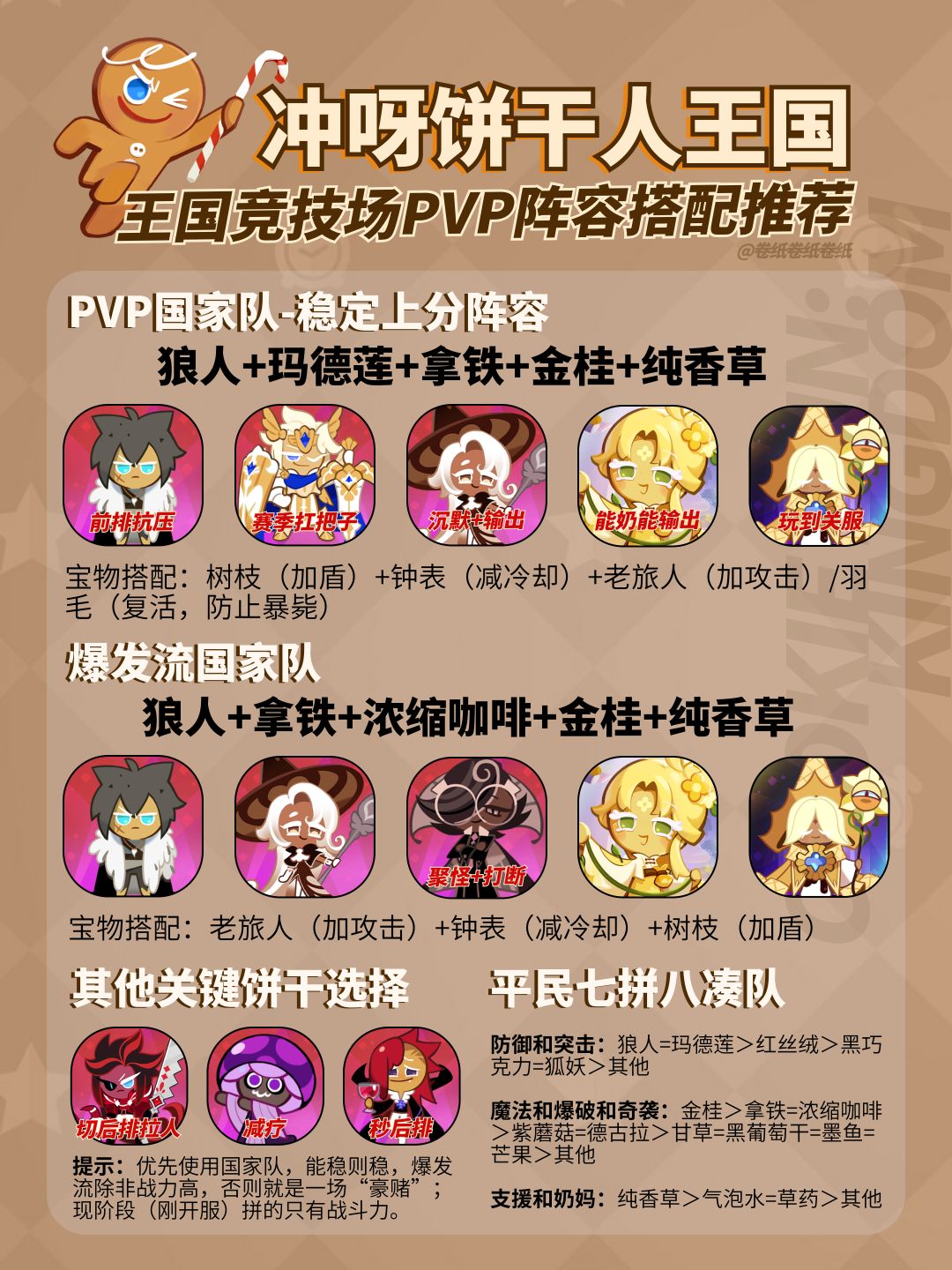 姜饼人王国PVP阵容搭配的整体思路:考虑到现阶段竞技场(JJC)主要是战力碾压互相秒的状况,这里主要是给到两种基本的配队策略。(先上图)