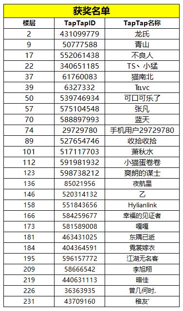 我们的活动截止1月14日就结束啦(〃'▽'〃)现在是公布获奖名单时间...截止活动结束时间总楼层为233楼,获奖名单如下: