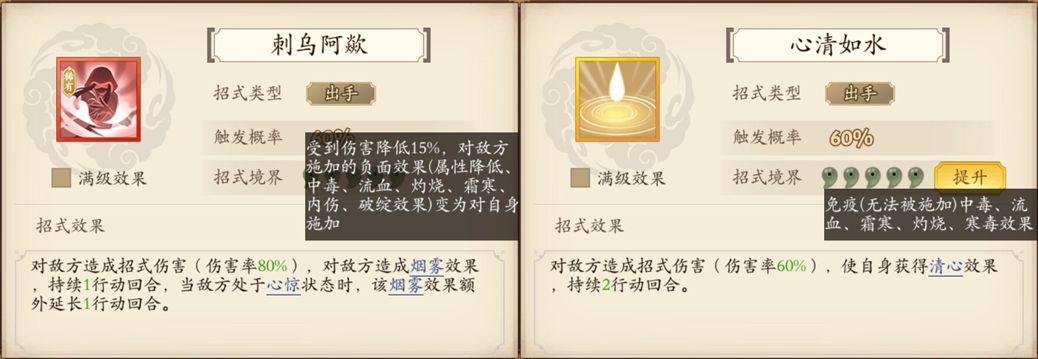 分析:先下结论,这个招式非常非常强,会破坏大部分后期强势的dot流派。该招式具有崭新的效果词条-烟雾,相较此前稍微接近的同样针对dot流派的词条-清心具有更强的克制dot能力,具体效果如图中所示。烟雾效果不同于清心的免疫特性,它会直接将对方施加的dot直接返还给对方,这里不仅仅是伤害的以彼之道还彼之身,还会破坏很多连动效果,例如调和剑武学的霜寒前置条件。虽然这里同样会给予对方一个15%的减伤效果,但是你要知道,携带刺乌的位置通常是前置位,前置位的核心通常是控制与拉条效果,因此该减伤效果并不会对后面的伤害位造成什么影响。另外当敌方处于心惊状态,此回合还会延长一回合,因此主要会有2种佩戴方案,1是以气海刀五虎枪为主的必定心惊招式配合刺乌达到2回合烟雾效果。2是以太祖长拳为主的概率心惊配合刺乌兼并风起云涌作为1号位起手。不论是哪种佩戴方案,都会极大的破坏目前dot的巅峰先手扇子流派。这里需要稍微介绍一下游戏内的结算顺序,如下视频所示,出手类附带状态效果的,会先叠加状态再计算后手伤害。因此当你携带刺乌攻击对方的青天扇时,此时会先给对方挂上刺乌的烟雾效果并结算出手伤害,然后对方触发青天扇后手伤害并将dot挂给自己,因此这也是为什么结论说会影响各种dot流派,战力高的玩家携带后将大幅减少被青天这种神技越战的可能性。因此最终建议,有条件的尽量拿到手,没条件的还是老老实实用清心即可。