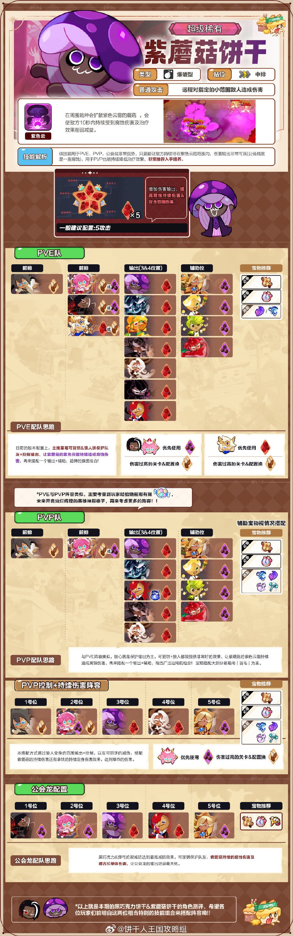 本期介绍的是两位强势饼干,黑巧克力的减防在讨伐中独一无二,而紫蘑菇的输出在竞技场中则是大热门,本期会从pve、pvp再到讨伐来逐一介绍他们的玩法。