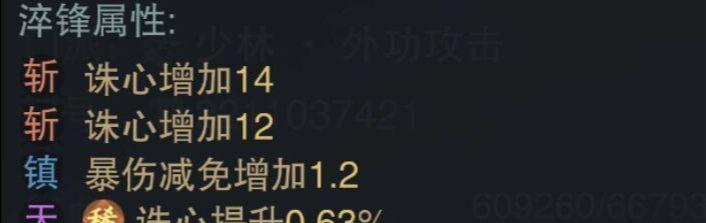 前三条选择两斩字一镇字,用铜钱冶铸残页和明月光开出字后再加入稀有材料点属性;属性以两诛心搭配一爆伤减免为主,如果感觉到自己的坚韧和同修比较起来较低还是选择两诛心搭配一坚韧为好。天罗优先选择以诛心提升为,次气血值上限提升,这一种淬锋会提升角色的一定肉度和输出,减少被秒杀的情况下加大了输出时效,适用的门派有华山,沧海,武当,和尚等。