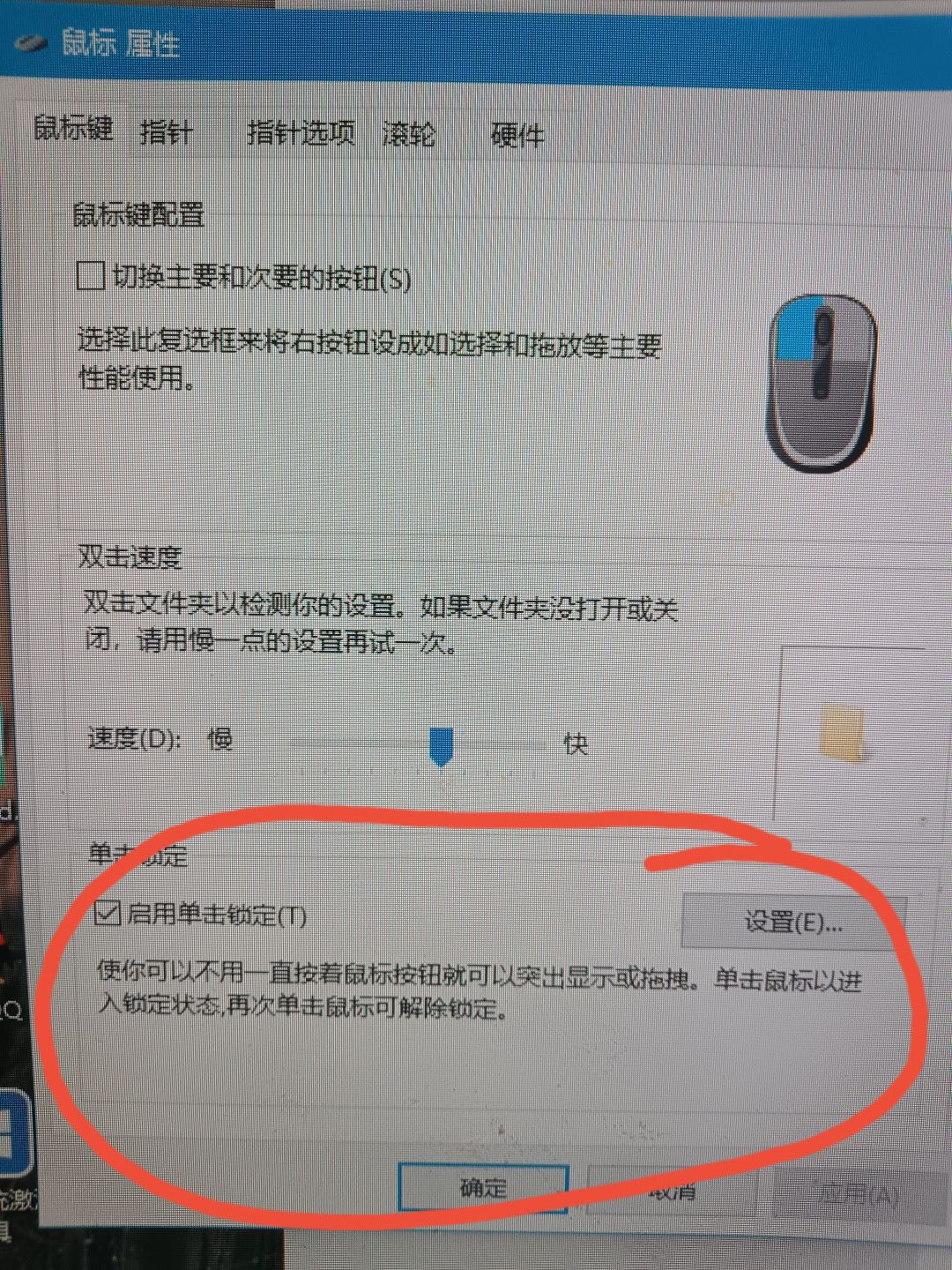开始前,电脑玩家先和我学设置,电脑点开下图鼠标设置,设置成鼠标长按一秒就锁定了。