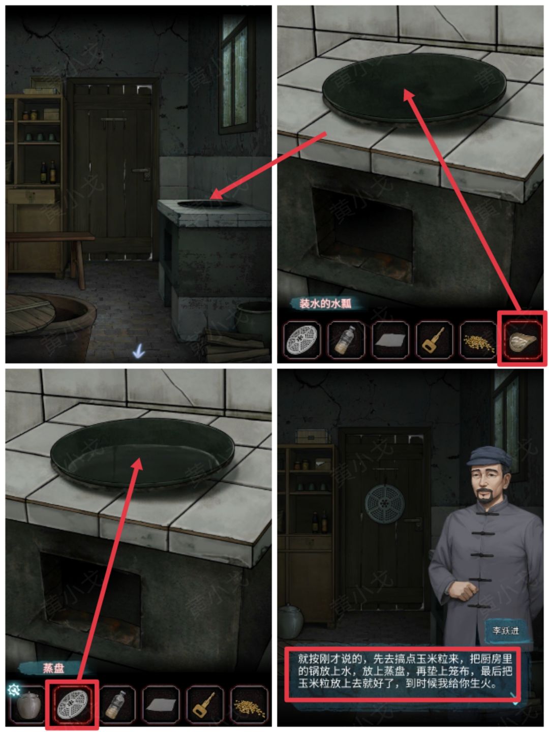 14.点击灶台,按照村长的说法,倒入【装入的水瓢】,放上【蒸盘】