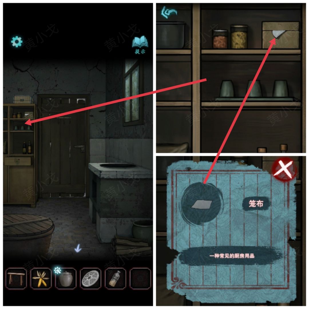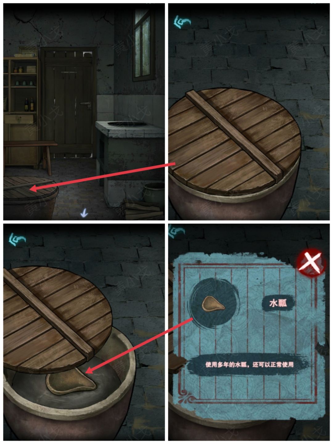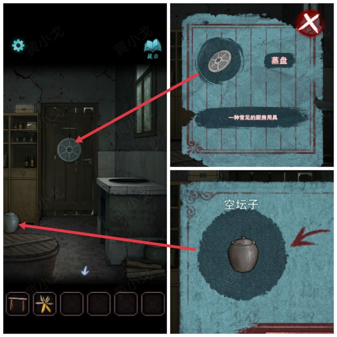 5.(厨房)点击获取地上的【空坛子】,挂在门上的【蒸盘】
