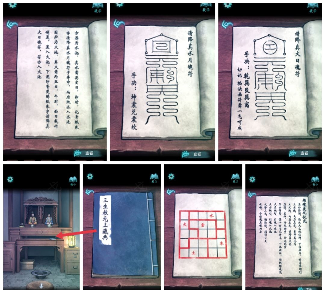 24.点击左边的柜子上的机关,查看游戏说明(根据《三生教无上藏典》上的提示,每行每列以及每个红线框内都有金木水火土),完成小游戏