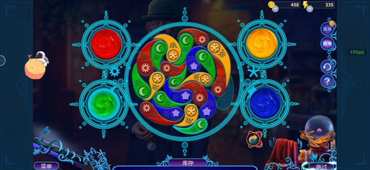 《三消游戏,不过不用一条直线,折线也可以,主要目标是消除右侧三种颜色,避免左面的三种颜色,右边三条攒满就赢了,随机分配,所以多试几次就能过》