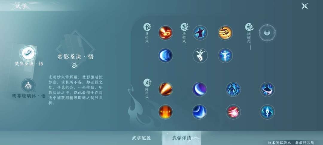明教武学由教主陆危楼所创,出招之时如有日月之威,往往能从敌人意想不到的地方发动摧枯拉朽般之攻击,常常令敌人难以捉摸,攻击落空,防不胜防。坚定的信仰则可令信徒受到明尊护佑,身化琉璃妙相,即便遭受攻击,也能从敌人身上获取新生的活力。
